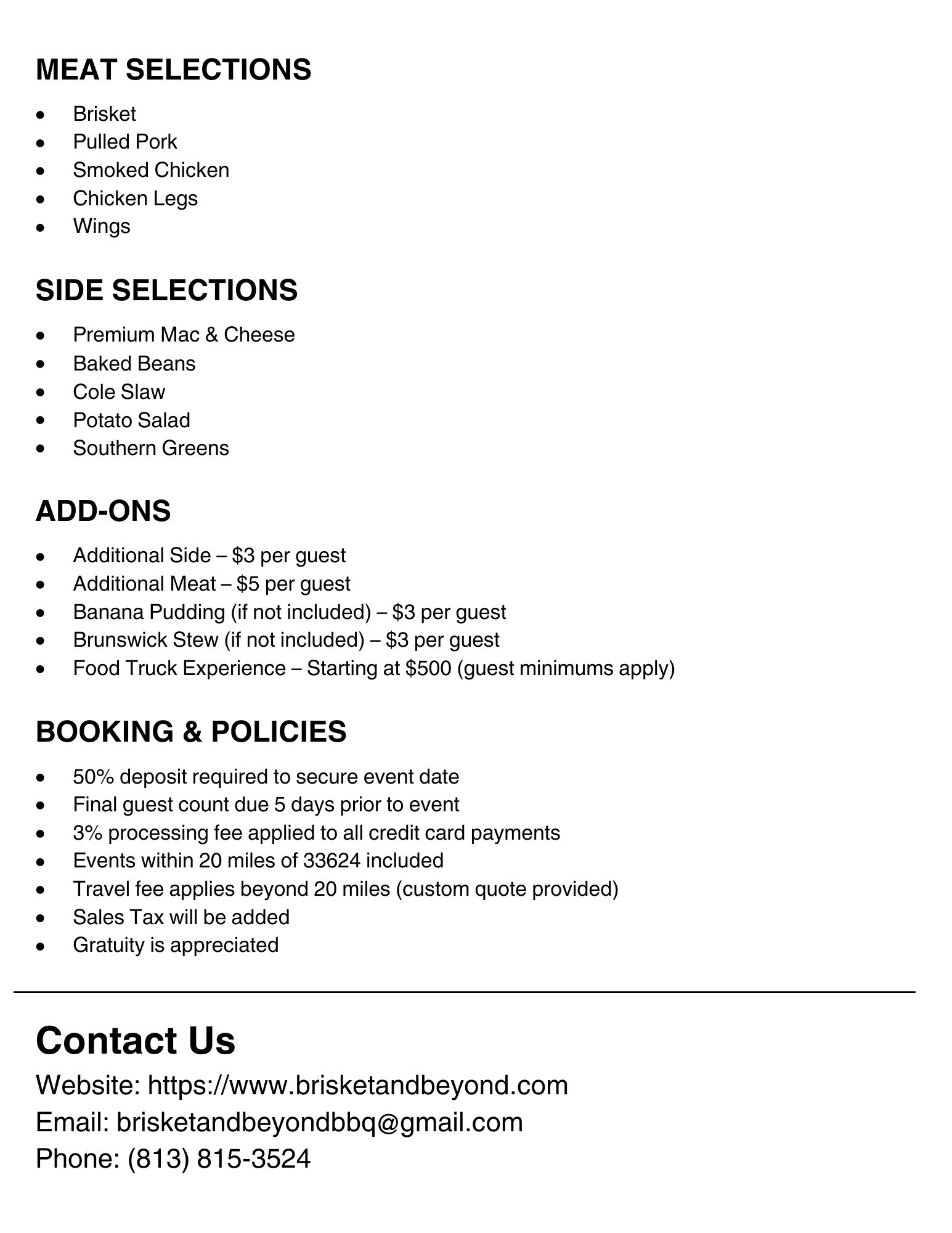 To contact us please email brisketandbeyondbbq@gmail.com or call (813) 815-3524