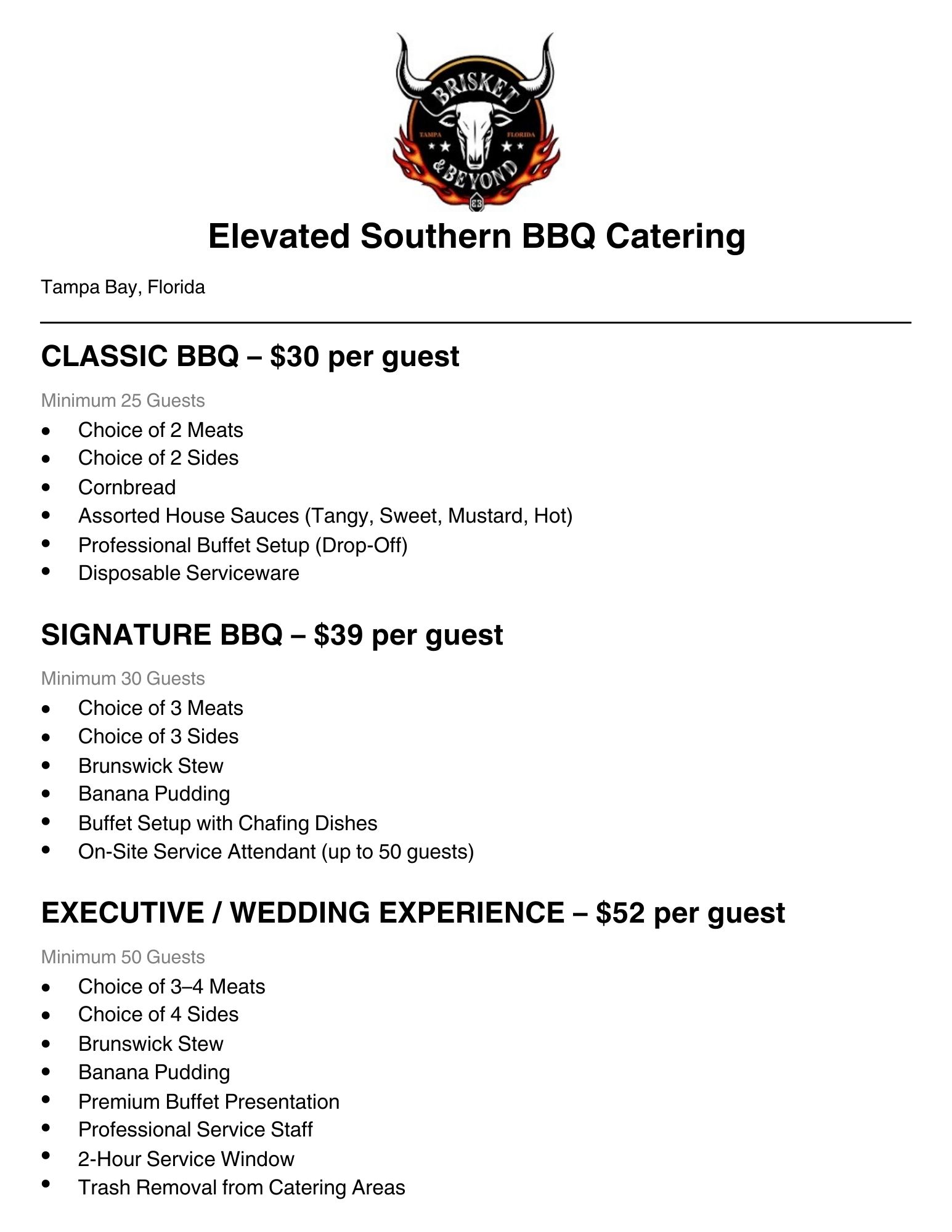 At Brisket & Beyond, we provide elevated Southern BBQ catering for corporate events, weddings, private parties, retreats, and special celebrations throughout the Tampa Bay area. Our catering packages are thoughtfully designed to deliver authentic slow-smoked meats, premium sides, and professional presentation that makes hosting effortless and memorable. Whether you’re planning an intimate gathering or a large-scale event, our team ensures exceptional food and seamless service from start to finish. If you have customized needs or don’t see exactly what you’re looking for, we’re happy to help. We can tailor packages to fit your event, including customized menus and cuisine options beyond our standard BBQ offerings. Contact us to create a catering experience designed specifically for your event.
